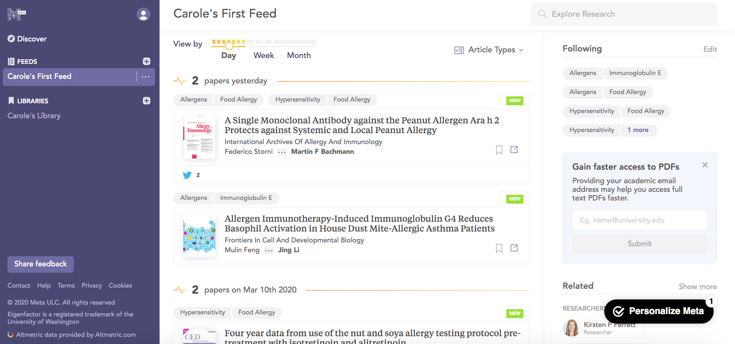 - Sous chaque article, Meta propose la liste des références et des citations si disponibles, extrait les différents grands concepts présents dans l’article, propose des flux d’informations Meta qui proposent des articles similaires et des « related articles ».