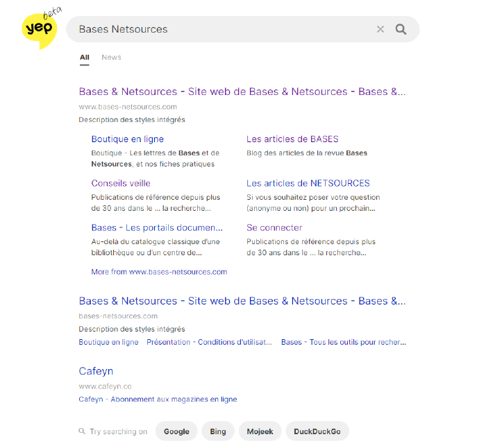 Étonnamment, sur Yep, les résultats de bas de page n’ont rien à voir avec notre société éditrice Bases Publications ou avec le site lui-même www.bases-netsources.com, il y a simplement le terme « Bases » dans le corps du texte, parfois déformé ou intégré dans un autre mot clé, comme dans « Databases » en anglais.