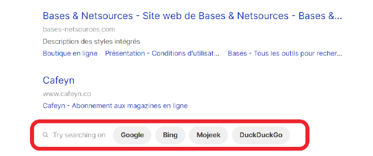 Les trois moteurs identifient correctement le lien vers le site web de BASES et NETSOURCES.