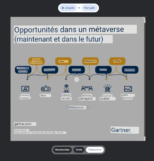 - « Traduction » qui permet de traduire le contenu textuel de l’image dans la langue de son choix, mais aussi de réintégrer la traduction directement sur l’image ;