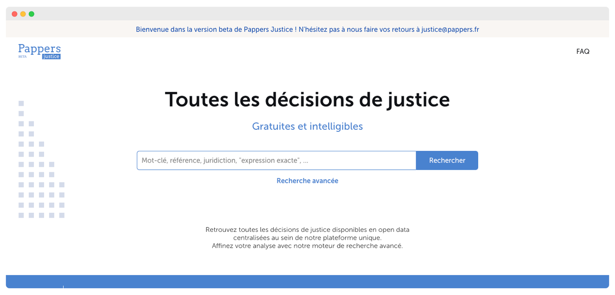 Le site utilise les données issues de l’open data des décisions de justice pour mettre en ligne l’ensemble des décisions de jurisprudence sur ses fiches entreprises. Pour effectuer une recherche au-delà de la consultation d’une fiche, il vaut toutefois mieux privilégier la version bêta du moteur dédié aux décisions de justice (https://justice.pappers.fr/), plus efficace que le moteur du site.