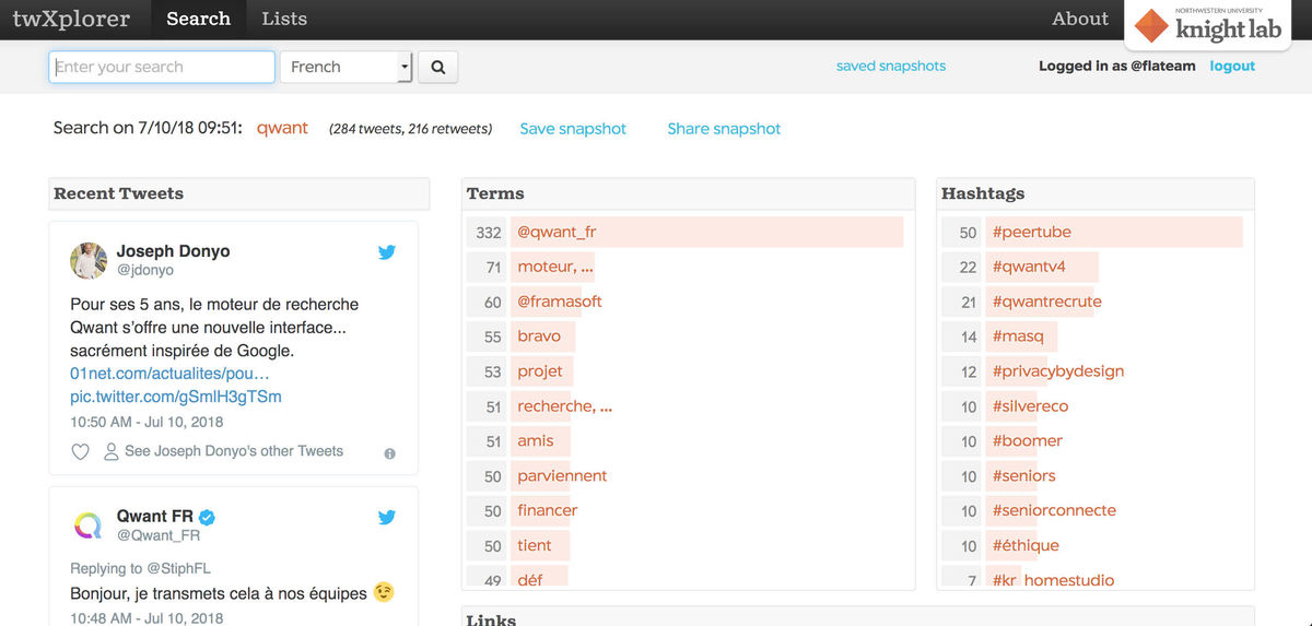 Même si le moteur interne de Twitter est déjà performant, on pourra citer un autre outil complémentaire Twxplorer (https://twxplorer.knightlab.com), développé par la NorthWestern University (voir figure 1.). L’outil permet de faire remonter les 500 derniers tweets les plus récents répondant à une requête donnée. Si les fonctionnalités de recherche sont on ne peut plus basiques, l’intérêt de cet outil ne réside pas là. Il permet surtout de visualiser les termes, hashtags et liens les plus cités par rapport à sa requête, ce qui offre une vision complémentaire à la simple liste de résultats classique.