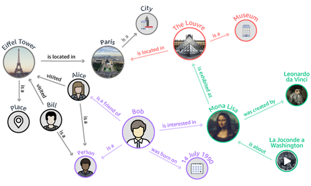 Les Knowledge Graphs sont des gigantesques bases de données qui permettent une représentation de la connaissance dans un format graphique. Les entités du monde réel ou d'un domaine d'activité (personnes, lieux, événements) sont représentés par des nœuds (nodes), qui sont reliés entre eux pour représenter les relations entre ces différentes entités.