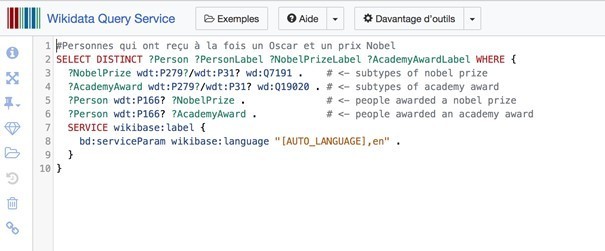 Pour rechercher les personnes qui ont à la fois reçu un Oscar et un prix Nobel, la requête s’écrira de la manière suivante (cf Figure 2. Requête SPARQL pour rechercher les personnes ayant reçu un Oscar et un prix Nobel)