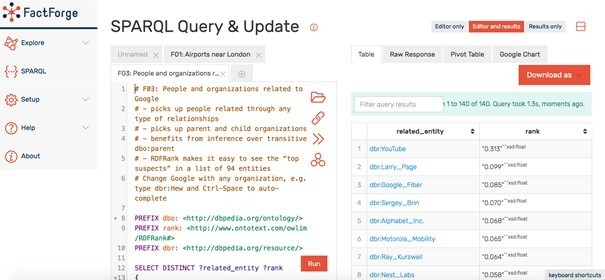 Dans la même veine, on citera également FactForge qui se fonde sur DBPedia, Geonames, WorldFacts et Wordnet mais aussi sur les données issues des Panama Papers. Il est spécialisé sur la recherche de personnes, organisations et lieux.