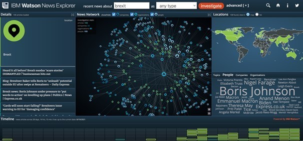 Lancé en 2015, IBM Watson News Explorer est un outil de recherche sur l’actualité fondé sur un Knowledge Graph (cf Figure 6. IBM Watson News Explorer). Il permet de rechercher puis de naviguer dans l’actualité à partir des entités repérées dans les articles de presse.