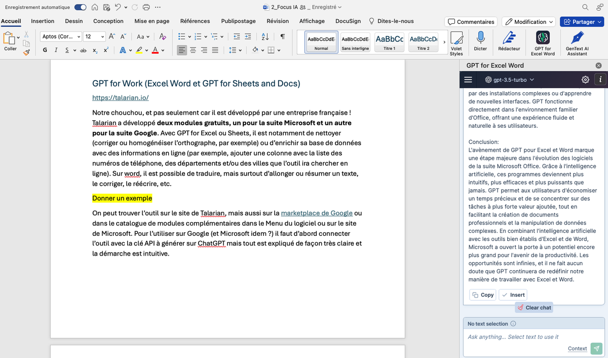 Attention toutefois au risque d’hallucinations dans ce cas. Pour le limiter, penser au prompt, testé et approuvé « Si tu ne sais pas, n’invente pas », qui réduit grandement la marge d’erreur. Sur Word et Docs, l’extension fonctionne en français et il est possible de créer ou modifier du texte.