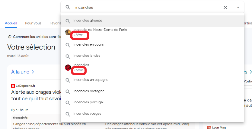 Ici, par exemple, en entrant le mot « incendies », on dispose d’une sélection d’autres mots plus précis, mais également du thème « Incendie de Notre-Dame de Paris ». Cette actualité moins récente pourrait s’avérer plus difficile à atteindre par la « voie classique » avec l’onglet « actualités » de l’index, compte tenu du bruit informationnel lié au contexte actuel.