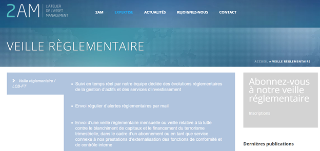 Figure 4 : page d’accueil présentant le service de veille réglementaire LCB-FT (Lutte Contre le Blanchiment et le Financement du Terrorisme) proposée par le cabinet 2AM