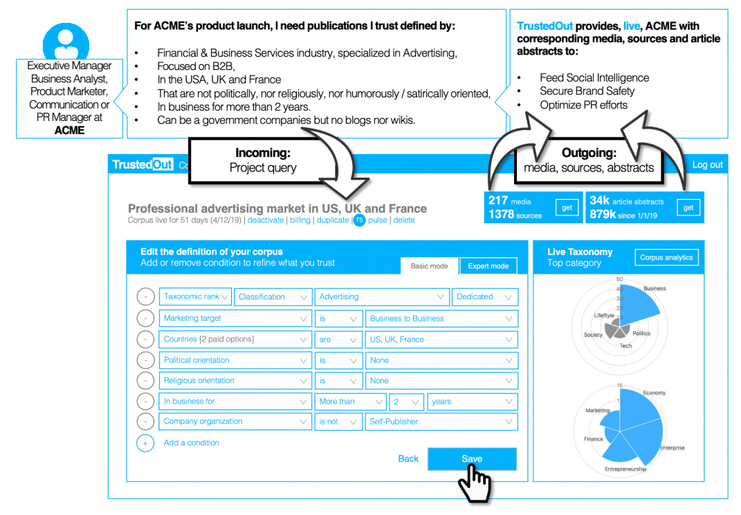 Et comme la confiance est personnelle (personne ne peut vous forcer à avoir confiance en quelque chose), il fallait fournir une base de données des profils des sources d’information pour que les analystes, professionnels du marketing, PR Managers puissent définir leurs corpus d’information (l’ensemble du contenu qui sera utilisé).