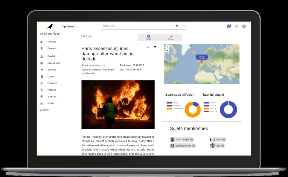 En nous basant sur une liste de 7000 sources de presses du monde entier, nous mettons en corrélation les articles (sans distinction de langues) pour les regrouper sous forme d’événements. Cela nous permet de proposer une revue de presse aussi bien internationale que nationale. Chaque article est récolté en temps réel pour retracer la diffusion mondiale d’une information et avoir un indice de fiabilité basé sur divers critères tels que le type et les relais de propagation, le style d’écriture ou bien la subjectivité du texte. Il est maintenant possible de retrouver les tweets faisant référence à un événement pour en analyser plus précisément l’impact.