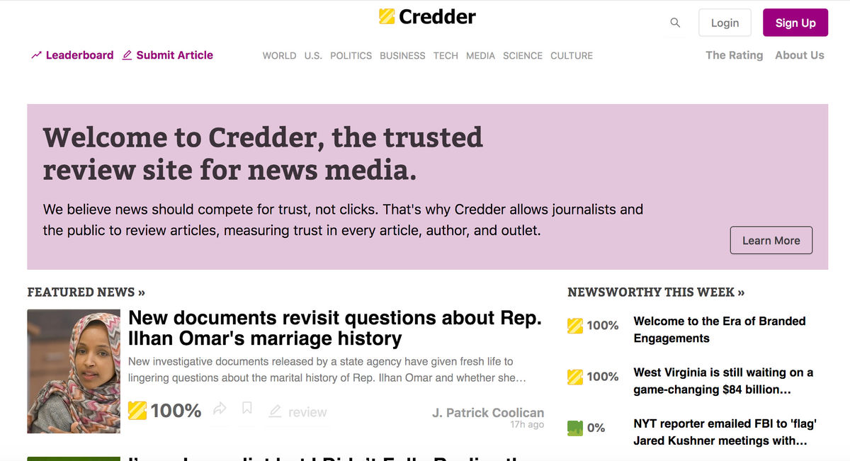 Sur un tout autre modèle, on trouve également la start-up Credder (voir figure 4) lancé à la fin de l’année 2018. Le but est ici d’évaluer la fiabilité des contenus, des sources et des auteurs. Cette évaluation est réalisée conjointement par des journalistes qualifiés et des internautes et chaque article, auteur ou média dispose alors d’un pourcentage de crédibilité. L’outil ne propose pas d’extension mais on peut y effectuer des recherches sur le titre d’un article, le nom d’un auteur ou le nom d’un média. L’outil ne semble proposer que des contenus et sources en anglais.