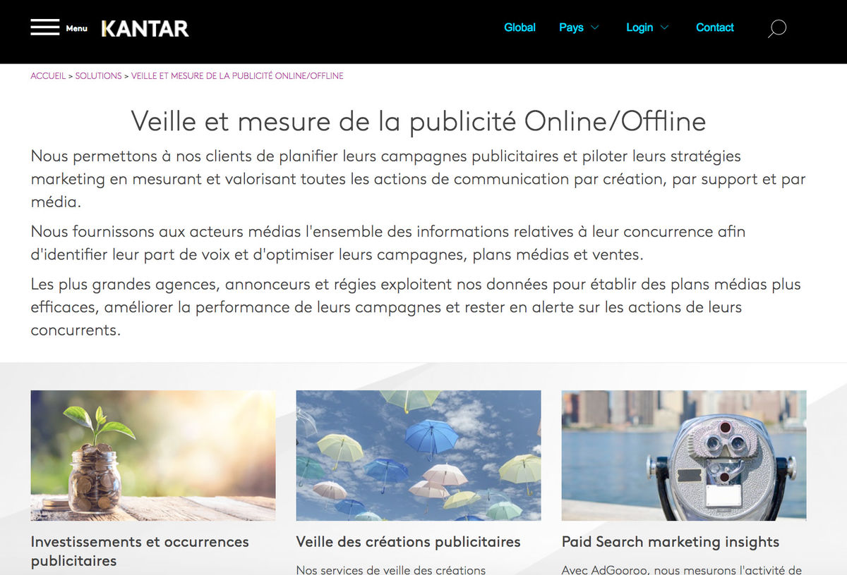 Lien : https://www.kantarmedia.com/fr/solutions/veille-et-mesure-de-la-publicite-online-offline.