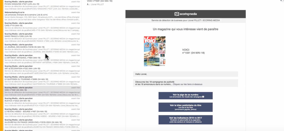 On trouve également Scoring Media (Mediatree Group qui est aussi connu pour ses services de veille audiovisuelle utilisés par la plupart des plateformes de veille et de social media monitoring pour les contenus TV/radio). Cette société propose un service de pige publicitaire sur 24 000 campagnes actives dans 3 600 secteurs d’activité, chez 15 000 annonceurs et sur 600 titres et 97 départements géographiques.