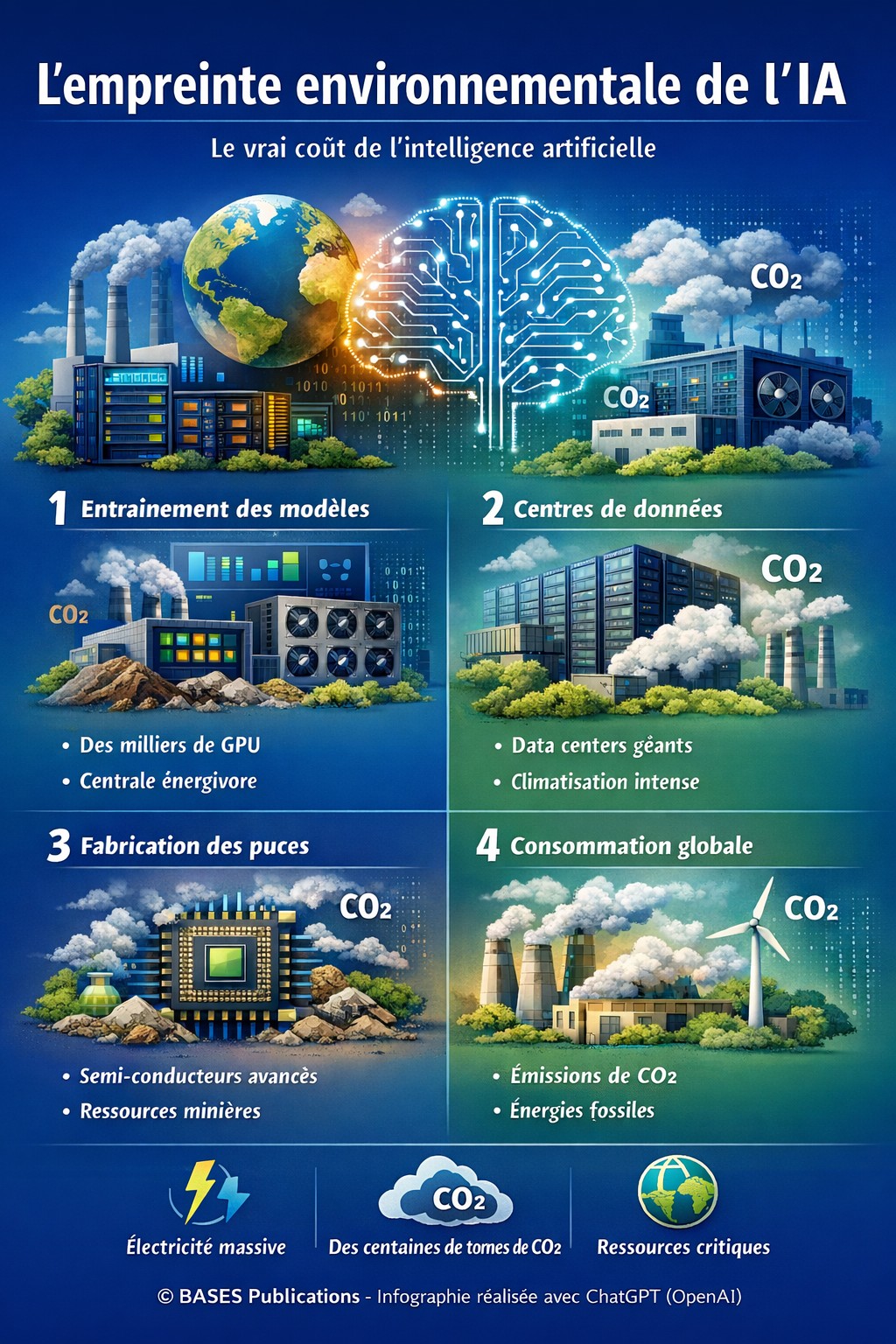 Plus les modèles deviennent puissants, plus ils nécessitent des infrastructures informatiques gigantesques : serveurs spécialisés, centres de données et supercalculateurs capables d'effectuer des milliards d'opérations. Toute cette puissance de calcul repose sur une consommation d'électricité importante, encore largement issue de sources d'énergie non renouvelables.
